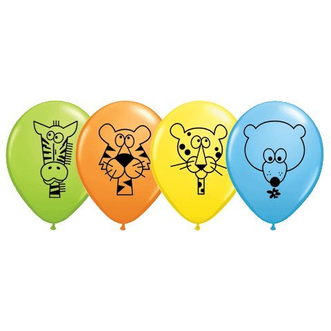 Green, Blue, Orange, and Yellow 11" latex balloons, printed on two sides in black. The Orange ballon has a Tiger, the Yellow has a Leopard, the Green has a Zebra, and the Blue has a Hyena. Sold 8 to a Package, assorted.